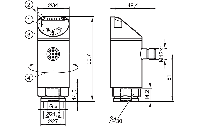 Два коммутирующих выхода, один из которых программируется как IO-Link, а другой*как аналоговый выход красно-зеленый дисплей для четкого определения допустимого диапазона возможность поворота технологического соединения для оптимального выравнивания высокая степень защиты от перегрузки обеспечивает долговременную стабильность надежная конструкция для использования в суровых промышленных условиях удобное управление с помощью кнопок или настройка параметров через IO-Link. |