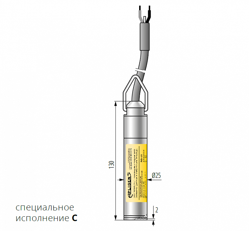»» Предел допускаемой приведенной погрешности: ±0,2% »» Выходной сигнал: 4...20 мА 0...10 В »» Взрывозащита (Ex): Ga/Gb Ex ia llC T4/T5/T6X Ex ia lllC T110°C Da PO Ex ia l Ma X Преобразователь давления измерительный гидростатический SG-25 предназначен для измерений гидростатического (избыточного) давления в жидкости, не имеющей механических примесей, вычисления на его основе глубины погружения или уровня жидкости и преобразования ее в унифицированный аналоговый выходной сигнал постоянного тока или постоянного напряжения. Преобразователь давления SG-25 предназначен для измерения уровня жидкости в резервуарах, скважинах, колодцах или пьезометрах.