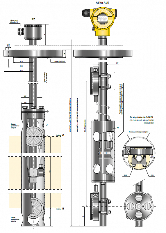 Преобразователь давления измерительный APR-2200D сконструирован на основе интеллектуального преобразователя разности давлений с двумя дистанционными разделителями. Размещенные по вертикали мембранные разделители соединены через капилляры с преобразователем разности давлений, находящимся в защитной трубе диаметром 80 мм. Рабочее положение плотномера – вертикальное, при этом зеркало измеряемой среды должно находиться выше края верхнего разделителя. |