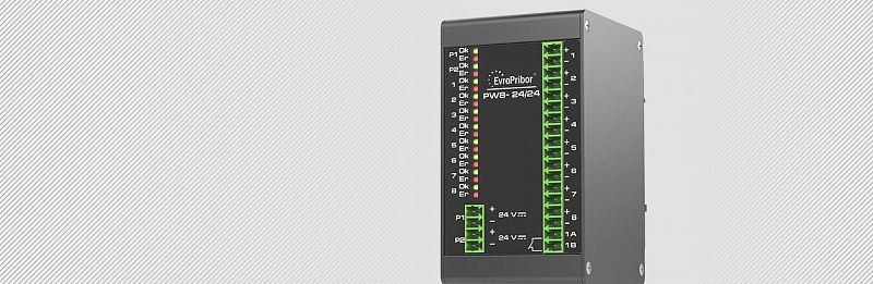 - PW8 имеет 8 (восемь) независимых гальванически изолированных выходных каналов напряжением 24 В и током нагрузки до 25 мА каждый.