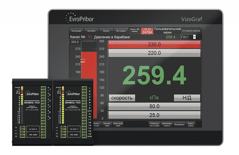 Визуализация измеряемых параметров формируется в виде понятных графиков, диаграмм, гистограмм, таблиц, комбинированных мнемосхем. Взаимодействие с комплексом осуществляется через цветную TFT Touch Screen панель оператора с диагональю дисплея 4; 7; 10; 12 либо 15 дюймов и набор модулей ввода/вывода Simbol-100-ХХХХ. Конструктивно комплекс может быть реализован в нескольких форм-факторах: моноблок или распределенная система (модули могут находиться на расстоянии до 1200 м от панели оператора по фактической длине линии).