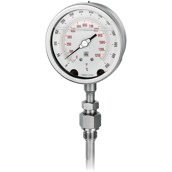 С инертным газом, антивибрационные. Эти приборы предназначены для измерения отработанного газа дизельных двигателей. ПРИМЕНЕНИЕ:Энергетика. Машиностроение (ОЕМ) МАТЕРИАЛ:Полностью из нержавеющей стали МАТЕРИАЛ КОРПУСА:нержавеющая сталь. Кольцо: нержавеющая сталь, байонетное крепление. Окно: закаленное стекло. МАТЕРИАЛЫ ВНУТРЕННИХ ЧАСТЕЙ:Механизм: нержавеющая сталь. Циферблат: алюминий, белый с черно-красной маркировкой. Указатель: регулируемый, черный алюминий. ЧУВСТВИТЕЛЬНЫЙ ЭЛЕМЕНТ:система объемного расширения, заполненная инертным газом УПЛОТНИТЕЛЬНАЯ ПРОКЛАДКА:силиконовая резина ФУНКЦИЯ:Локальная индикация УСЛОВИЯ ЭКСПЛУАТАЦИИ:Вибрации. Пульсирующее давление ПОГРЕШНОСТЬ:1,0 в соответствии с EN 13190 СООТВЕТСТВИЕ:Стандарт EN 13190 ДИАПАЗОН:0...650°C СТЕПЕНЬ ЗАЩИТЫ:IP69 согласно EN 60529/IEC 529 ПРЕДЕЛ ДАВЛЕНИЯ:25 бар (без защитной гильзы) ТЕМПЕРАТУРА ОКРУЖАЮЩЕЙ СРЕДЫ:-25…+65°С ПРИСОЕДИНЕНИЕ К ПРОЦЕССУ:нержавеющая сталь AISI 303 ЗАПОЛНЕНИЕ:силиконовое масло с высокой вязкостью КОЛБА, ГИЛЬЗА:нержавеющая сталь AISI 316. S24 - ∅9,5 мм, с жестким капилляром ∅12,7 мм. ГЛУБИНА ПОГРУЖЕНИЯ:140...450 мм |