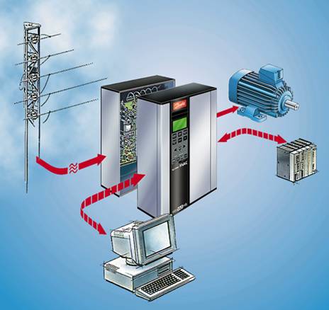 Плата управления, аналоговые и дискретные входы и выходы, последовательный коммуникационный интерфейс RS 485 преобразователя частоты гальванически изолированы от питающего напряжения. |