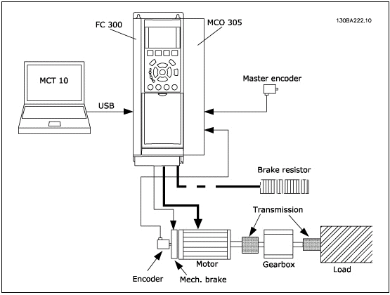 Система MCO 305 включает следующие элементы: Преобразователь частоты VLT AutomationDrive FC 300. Модуль MCO 305. Мотор/мотор-редуктор. Энкодер обратной связи. Энкодер должен быть установлен на вал двигателя при работе FC 300 в режиме Flux с обратной связью, энкодер обратной связи для позиционирования и синхронизации может быть установлен в любом месте в приложении. Энкодер мастера (только для синхронизации). PC с MCT 10 для программирования. Так же могут потребоваться: Тормозной резистор для динамического торможения. Механический тормоз. Система MCO 305 |
