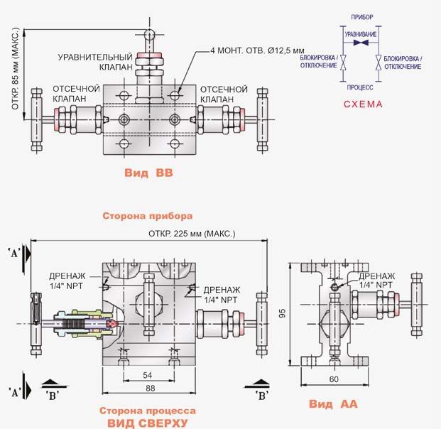 3-вентильный блок EUROPRIBOR (соединение «фланец – фланец») используется для подключения импульсных линий и измерительных преобразователей разности давлений. Блок имеет входы с расстоянием между центрами входных отверстий 54 мм (2 1/8’’), один уравнительный клапан и два отсечных клапана.